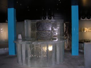 昼食を食べて、飛行機の時間つぶしのため、Ice Barに行く。氷を切り出して、バーカウンターや席を作った施設で、ポンチョを着て、見て回る。時間が早いせいか、他に客もおらず、1人で貸切だった。
